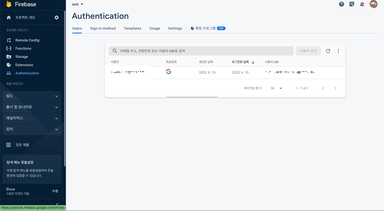 로그인이 완료되면 firebase에 이렇게 로그인 기록이 남는다